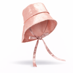 Blush sequin asymmetric bucket hat with ties.