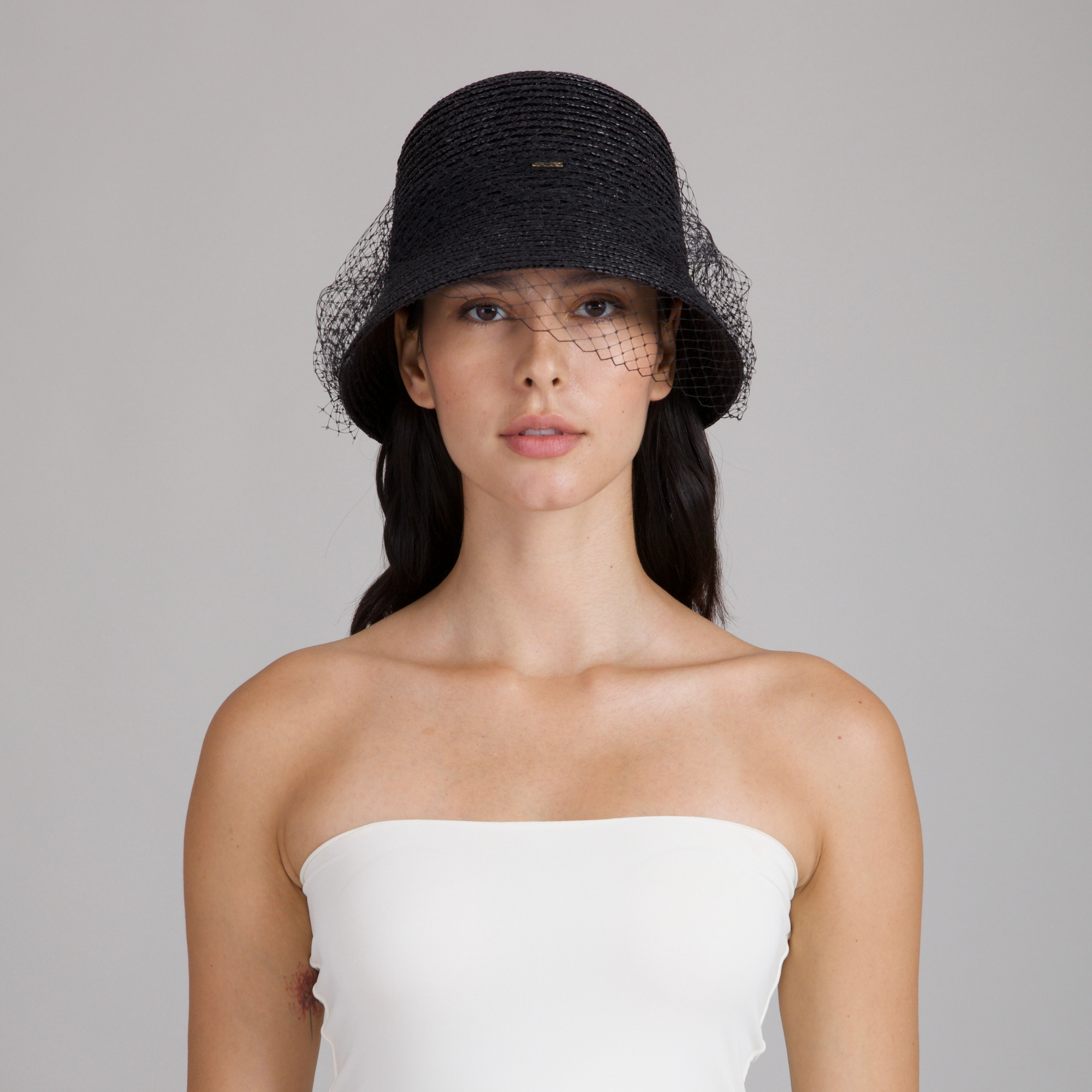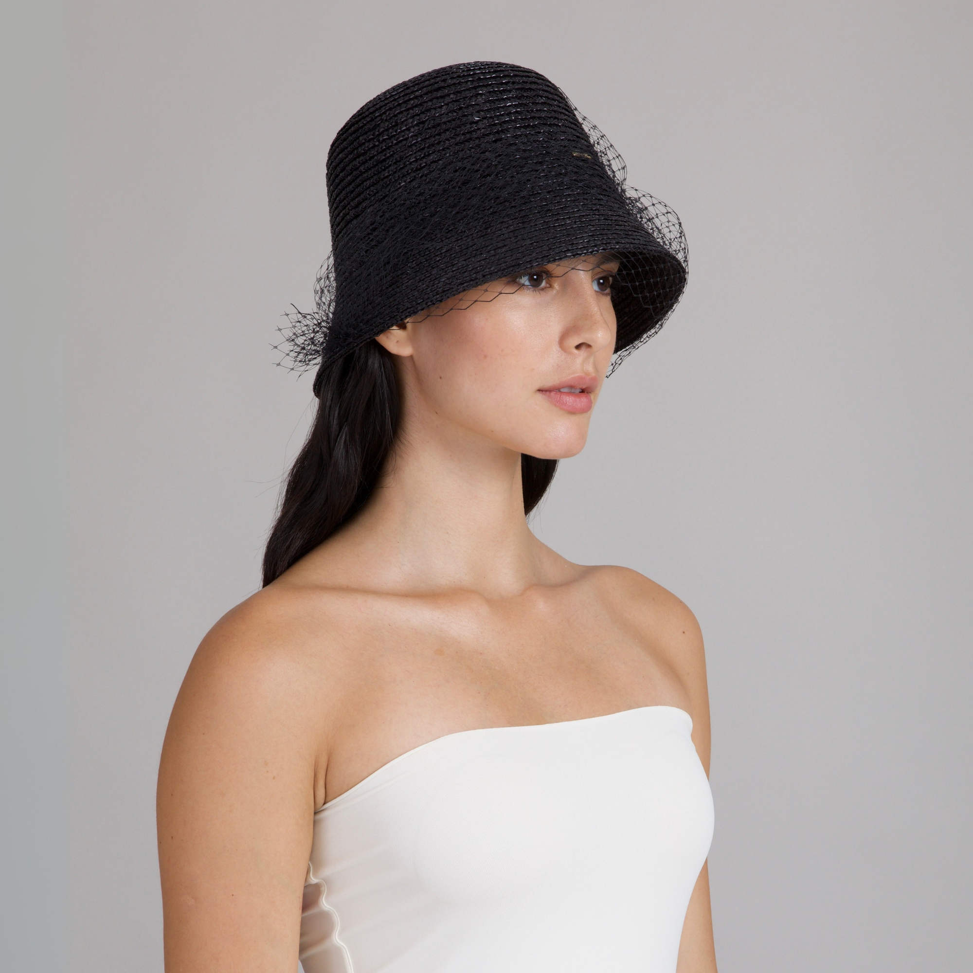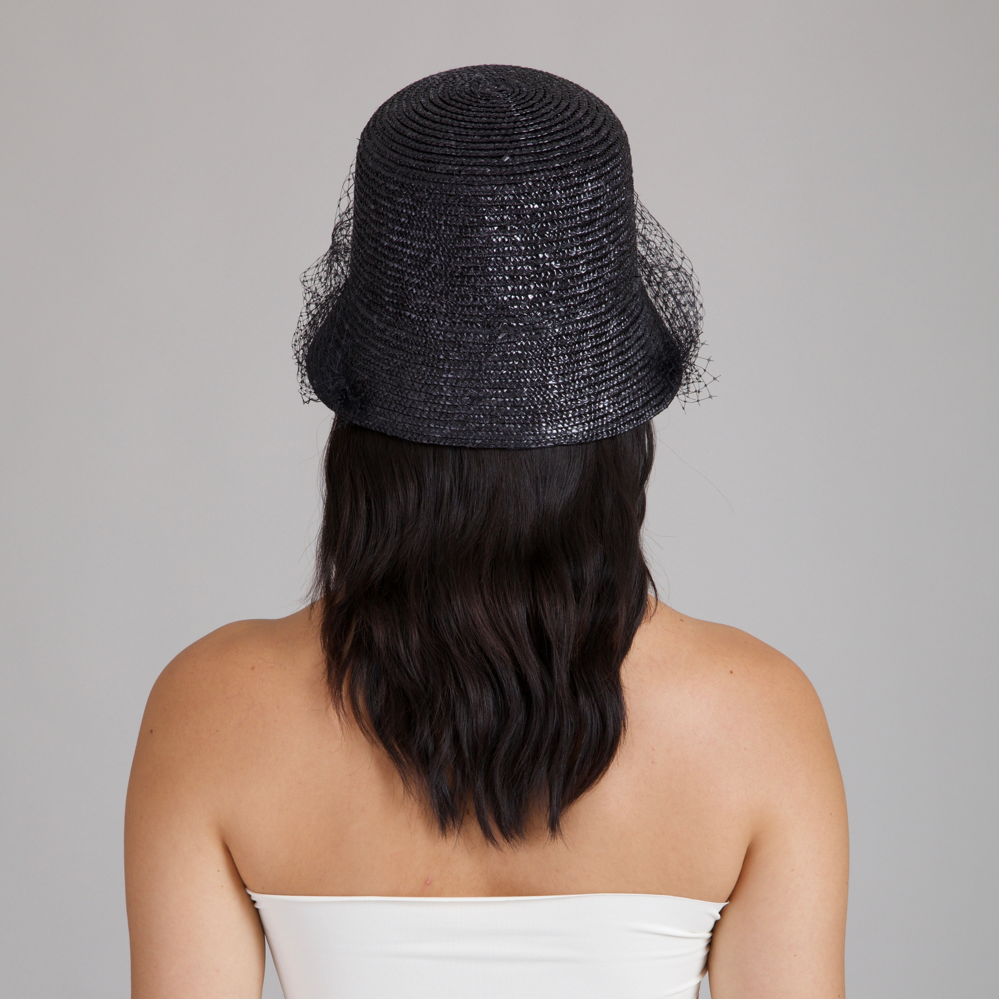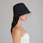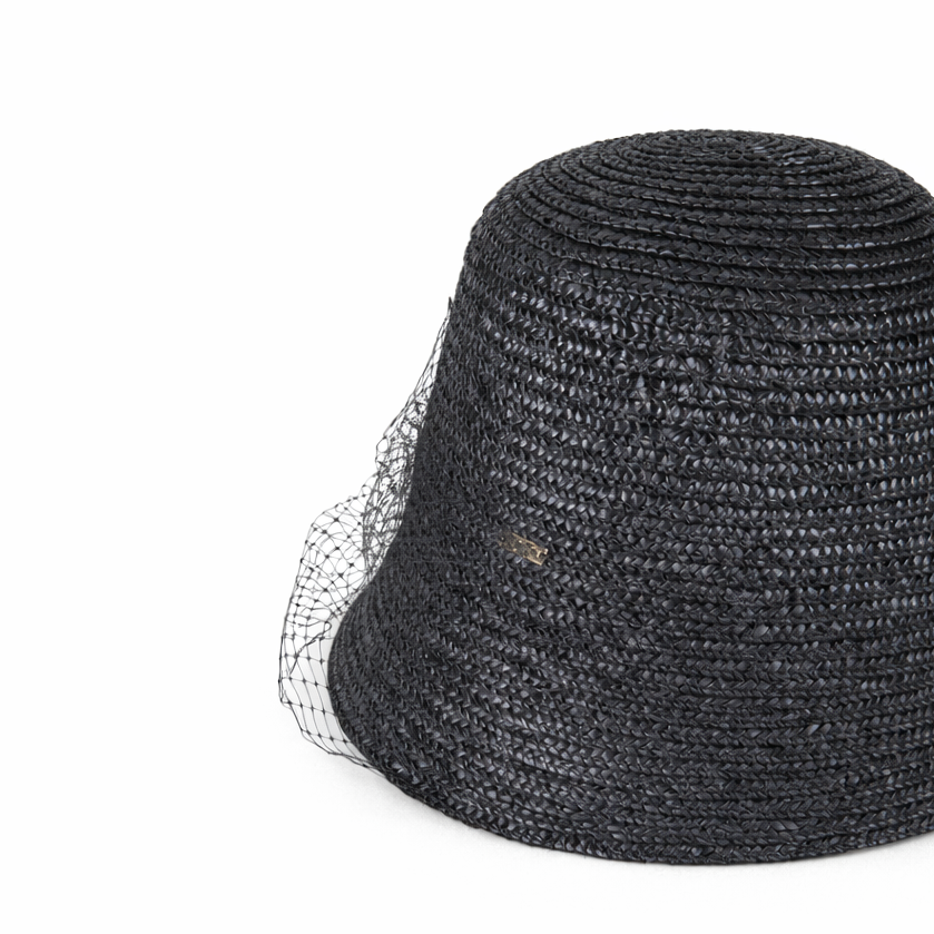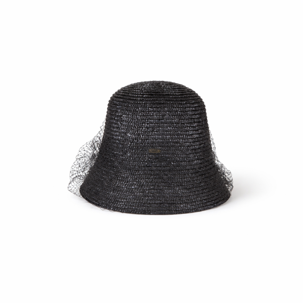 A glossy black lacquered fine wheat braid bucket hat veiled in delicate birdcage netting, where sun protection meets cinematic allure.