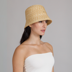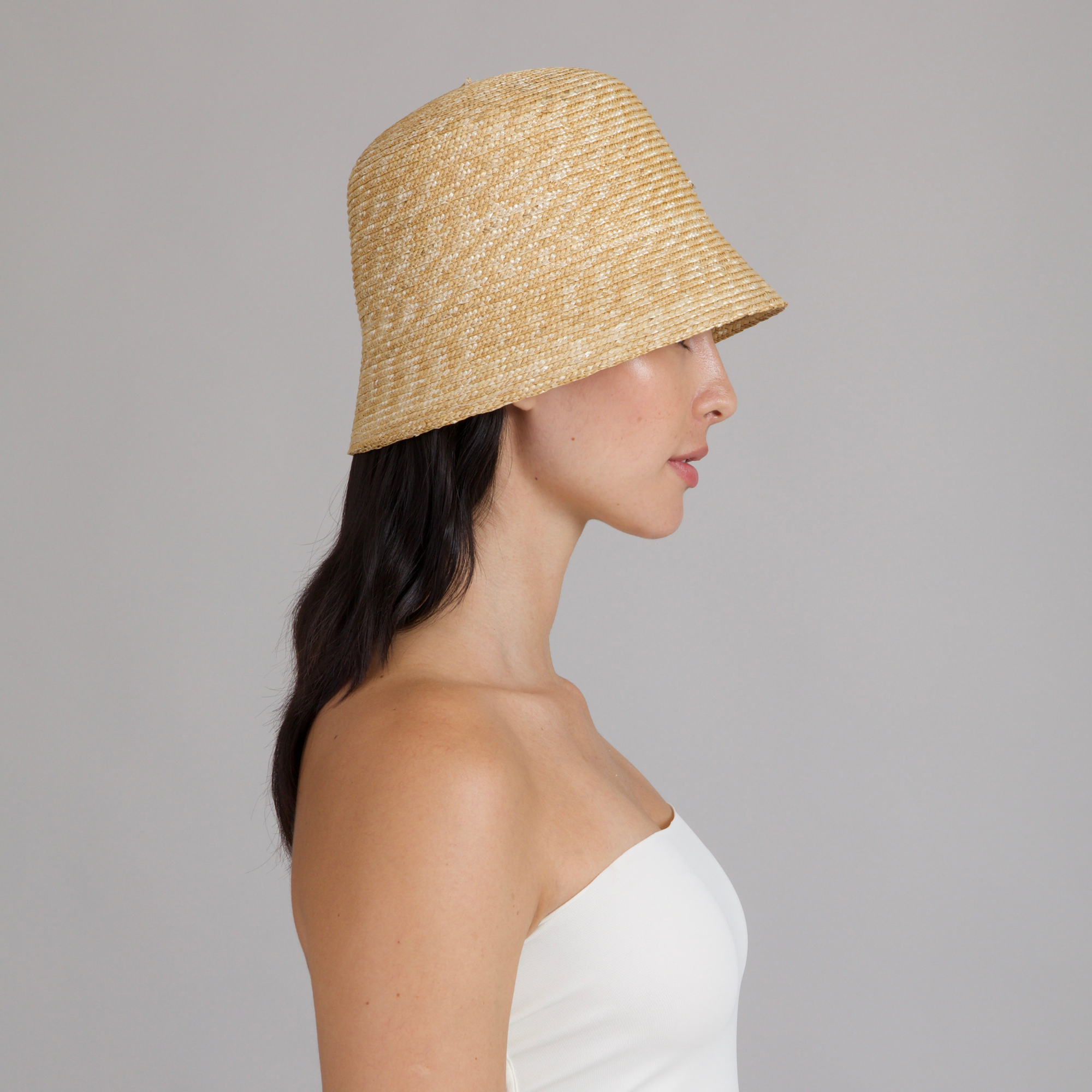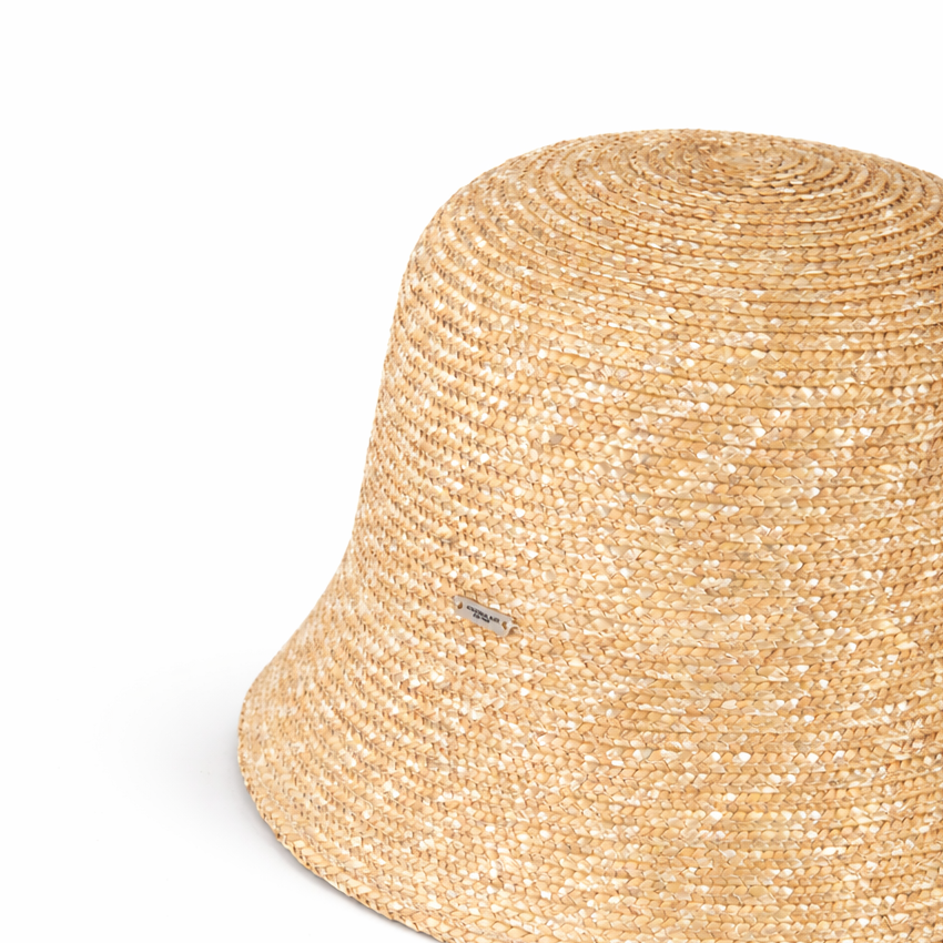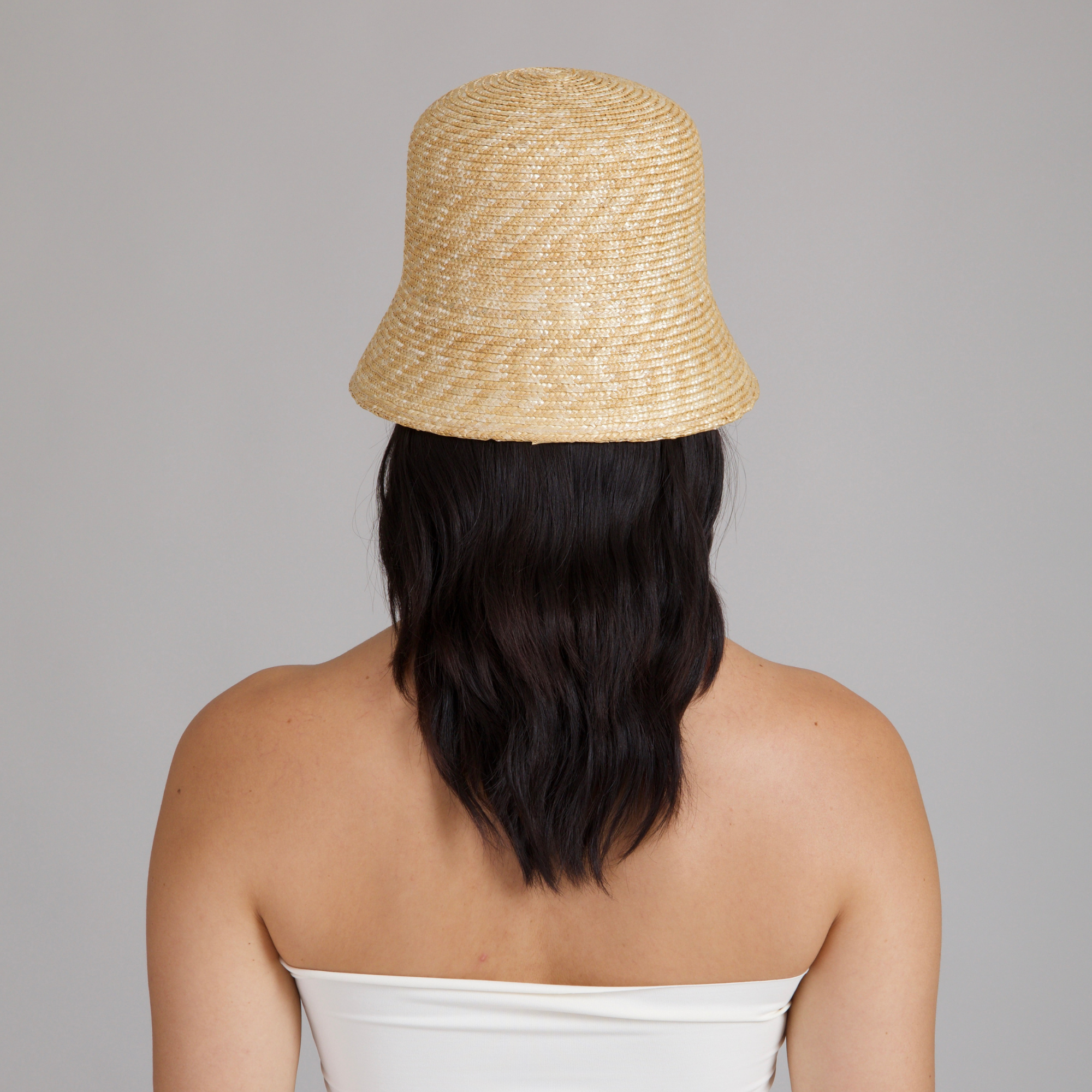 A delicately woven natural fine wheat braid bucket hat that pairs timeless texture with luminous sun protection.