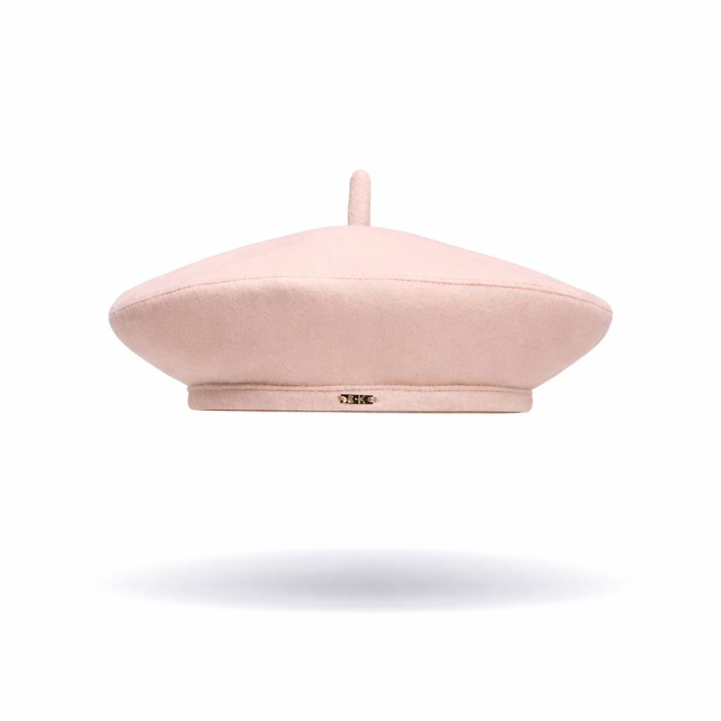 Blush cashmere beret with silver logo plate.