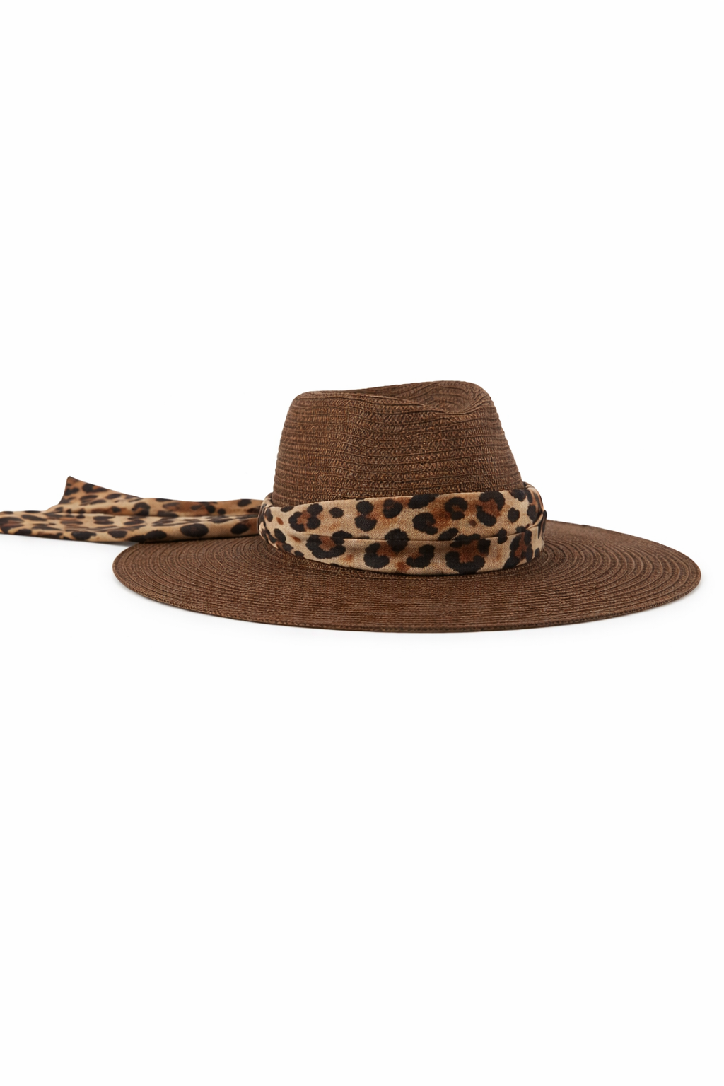 The Cassidy Wide Brim Fedora delivers effortless luxury in a chic chocolate Toyo straw, offering refined sun protection wrapped in timeless style. Cassidy embodies sleek, easy comfort beneath warm sunlight, making it an essential sun hat for elevated everyday wear. Finished with a striking leopard-print satin pull-through scarf and expertly crafted details.