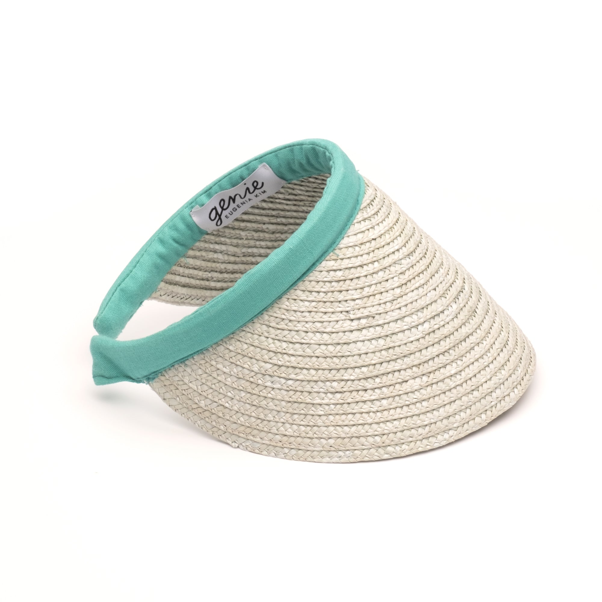 Natural straw visor with mint linen sweatband and natural frayed trim.