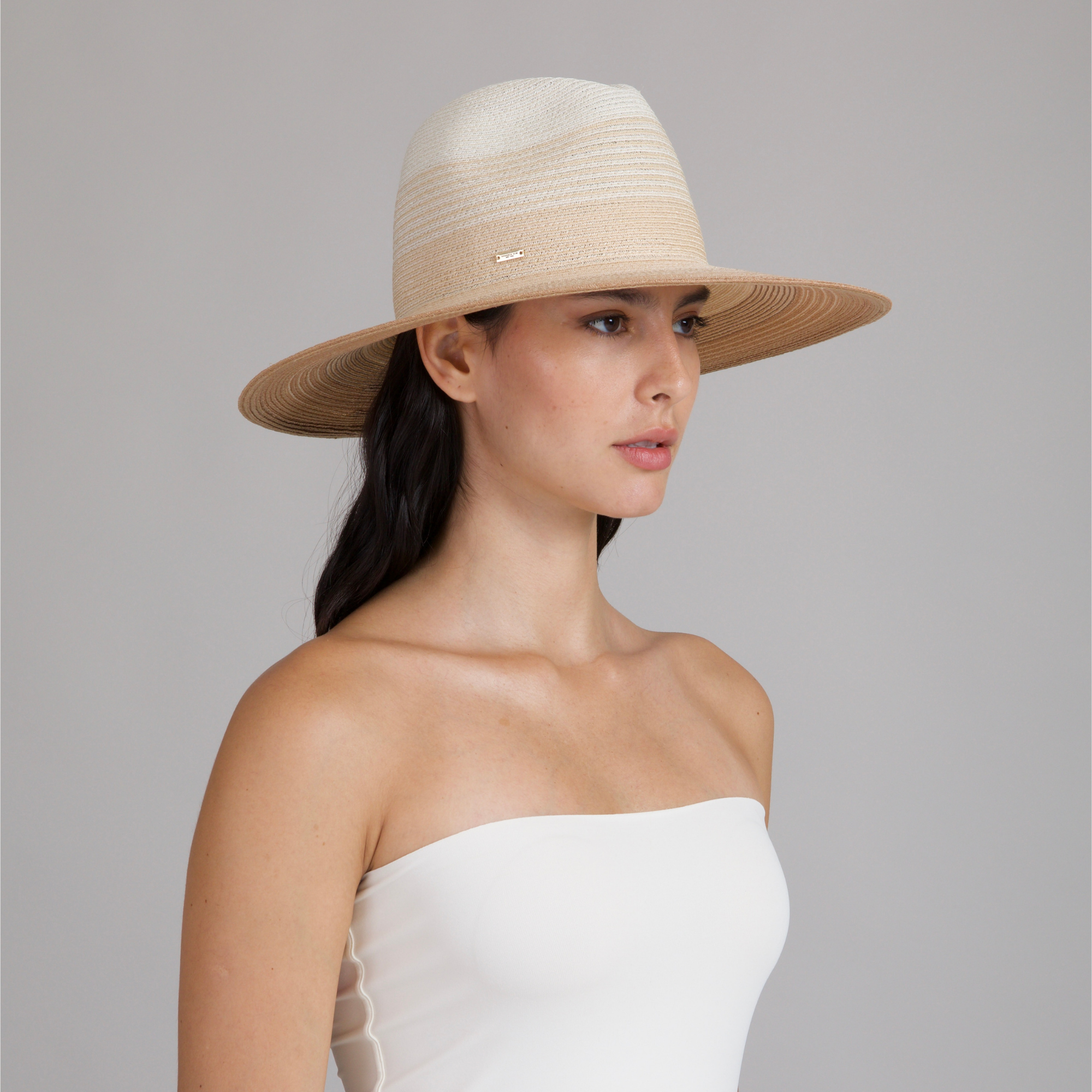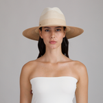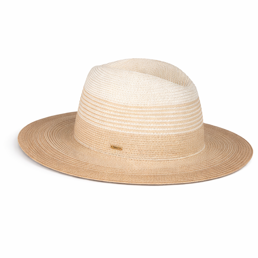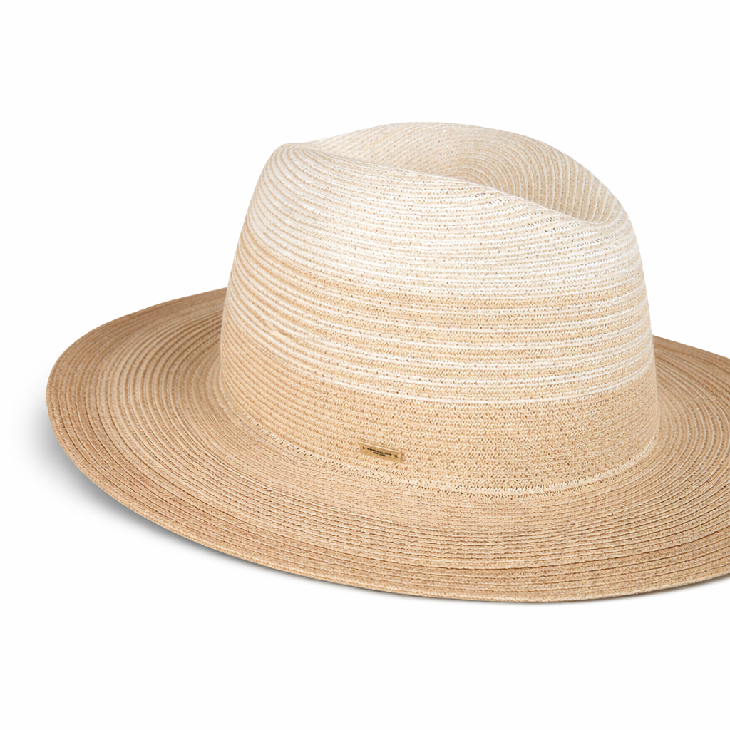 A softly graduated ivory-to-camel ombré hemp fedora that evokes sunlit horizons, crafted to travel effortlessly and shield with elegance.