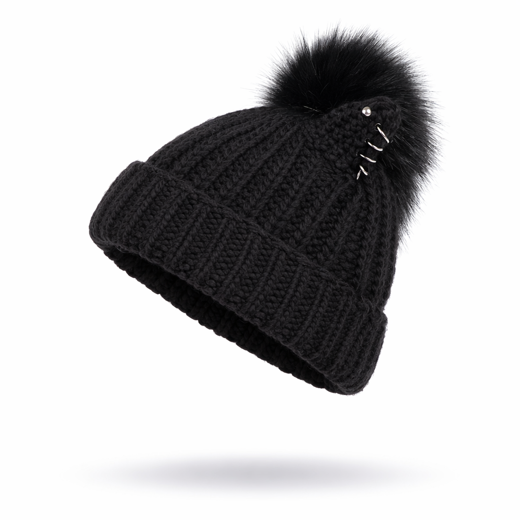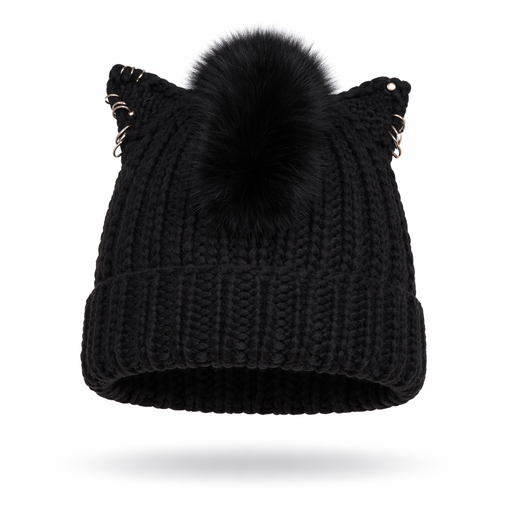 Black chunky wool hand-knit beanie with black fox mohawk and silver pierced ears.
