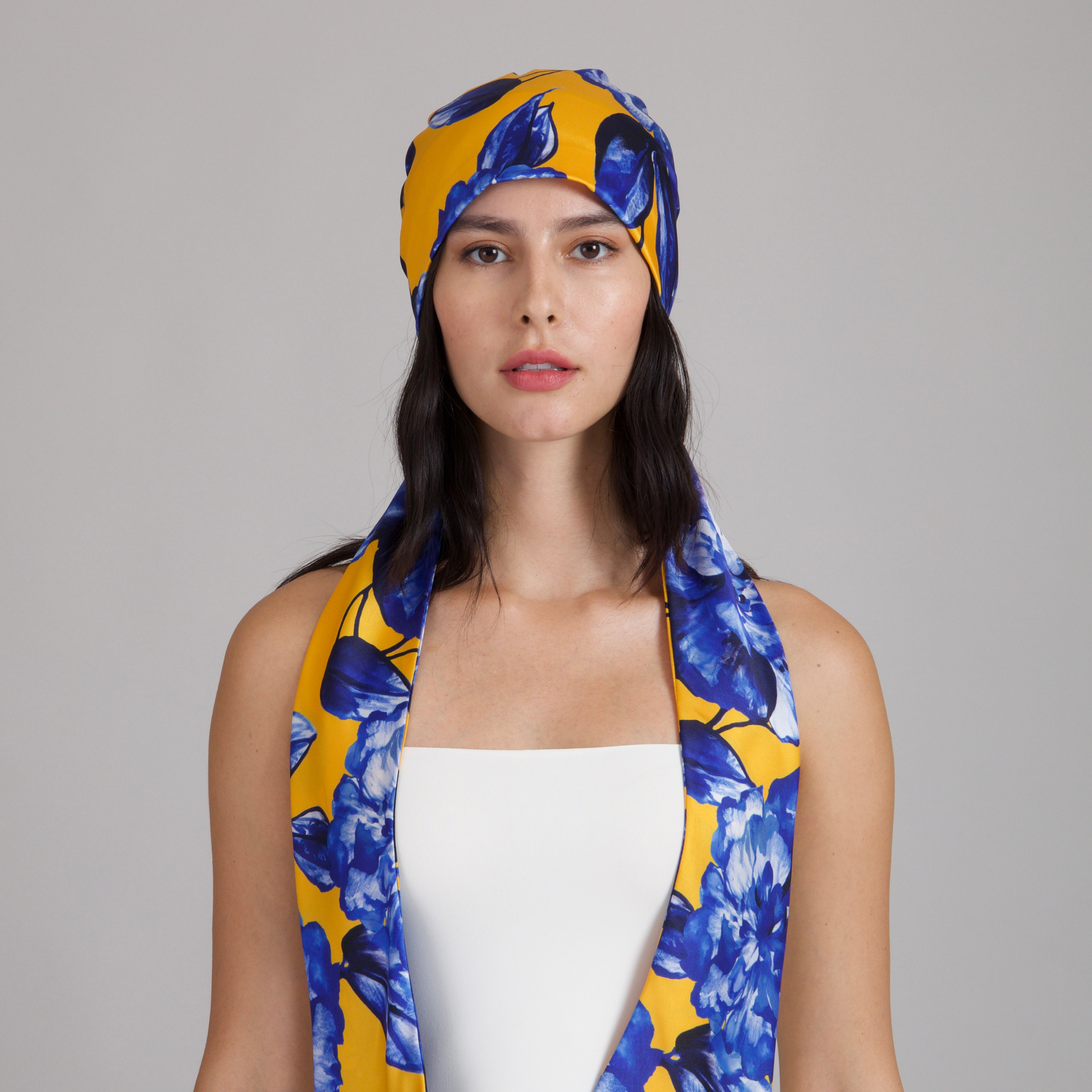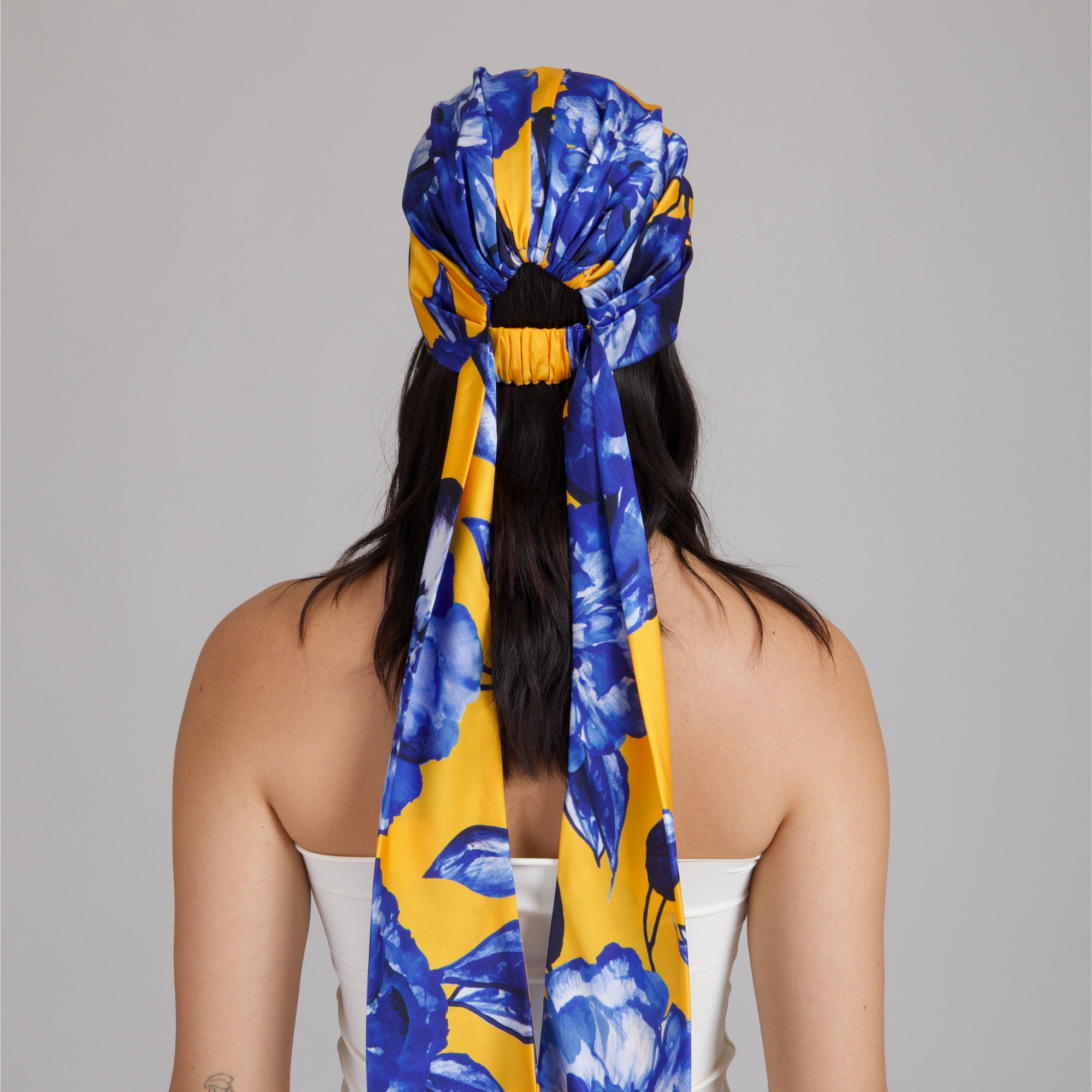 A vibrant papaya and cobalt floral-print satin headscarf with fluid tails, made to frame the face with effortless romance.