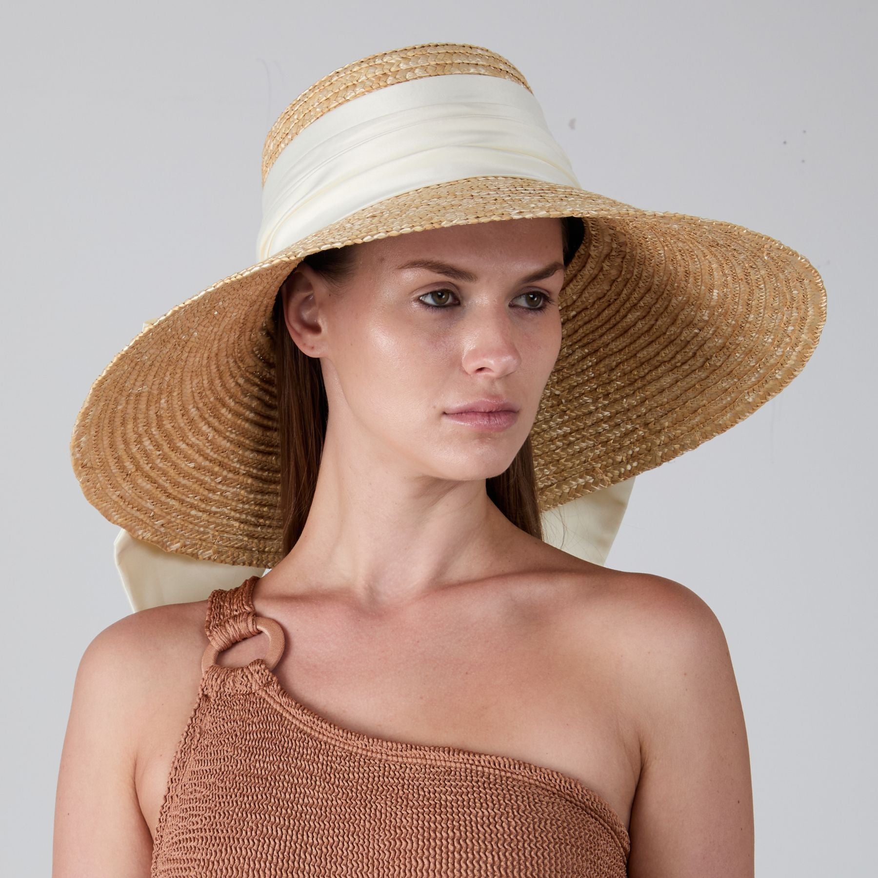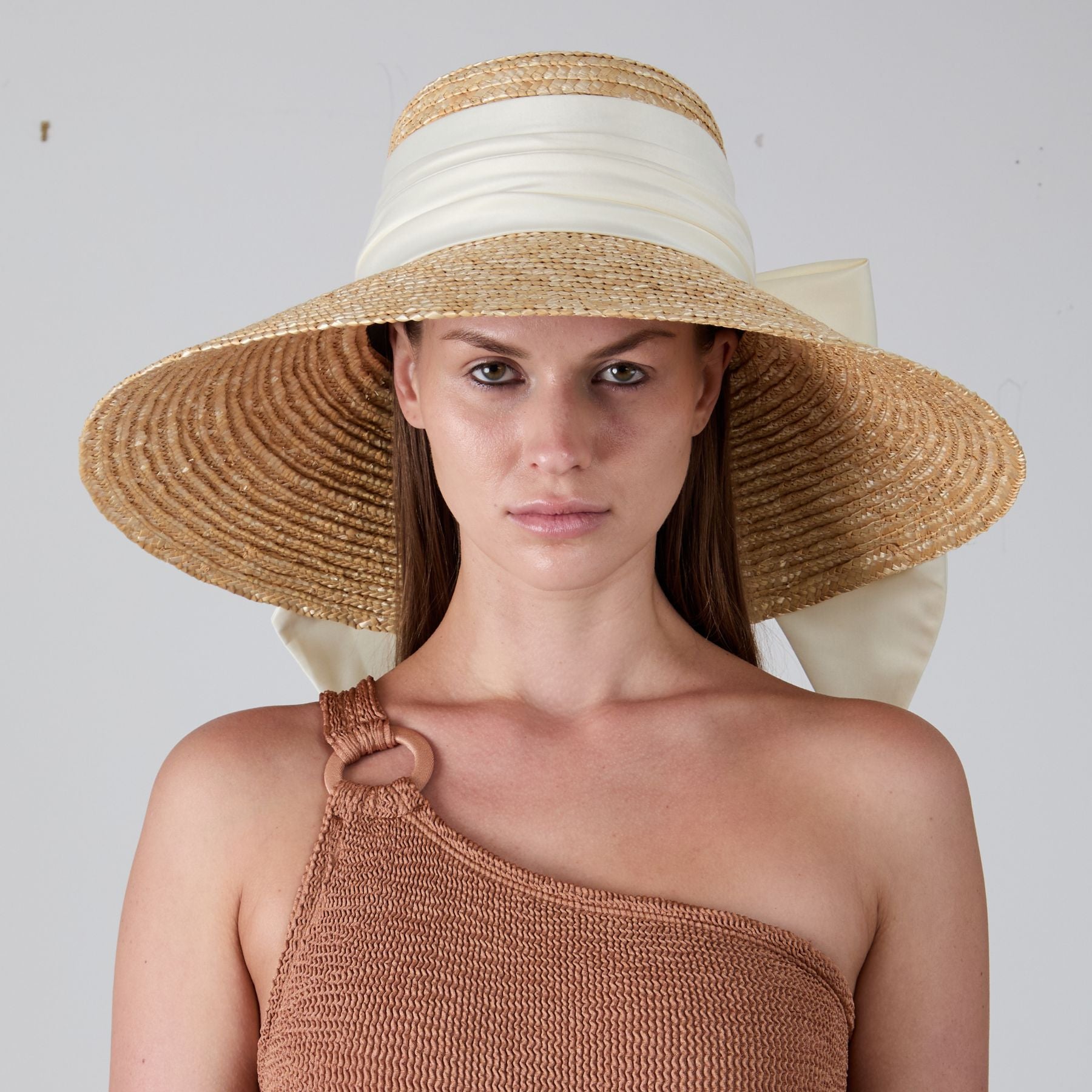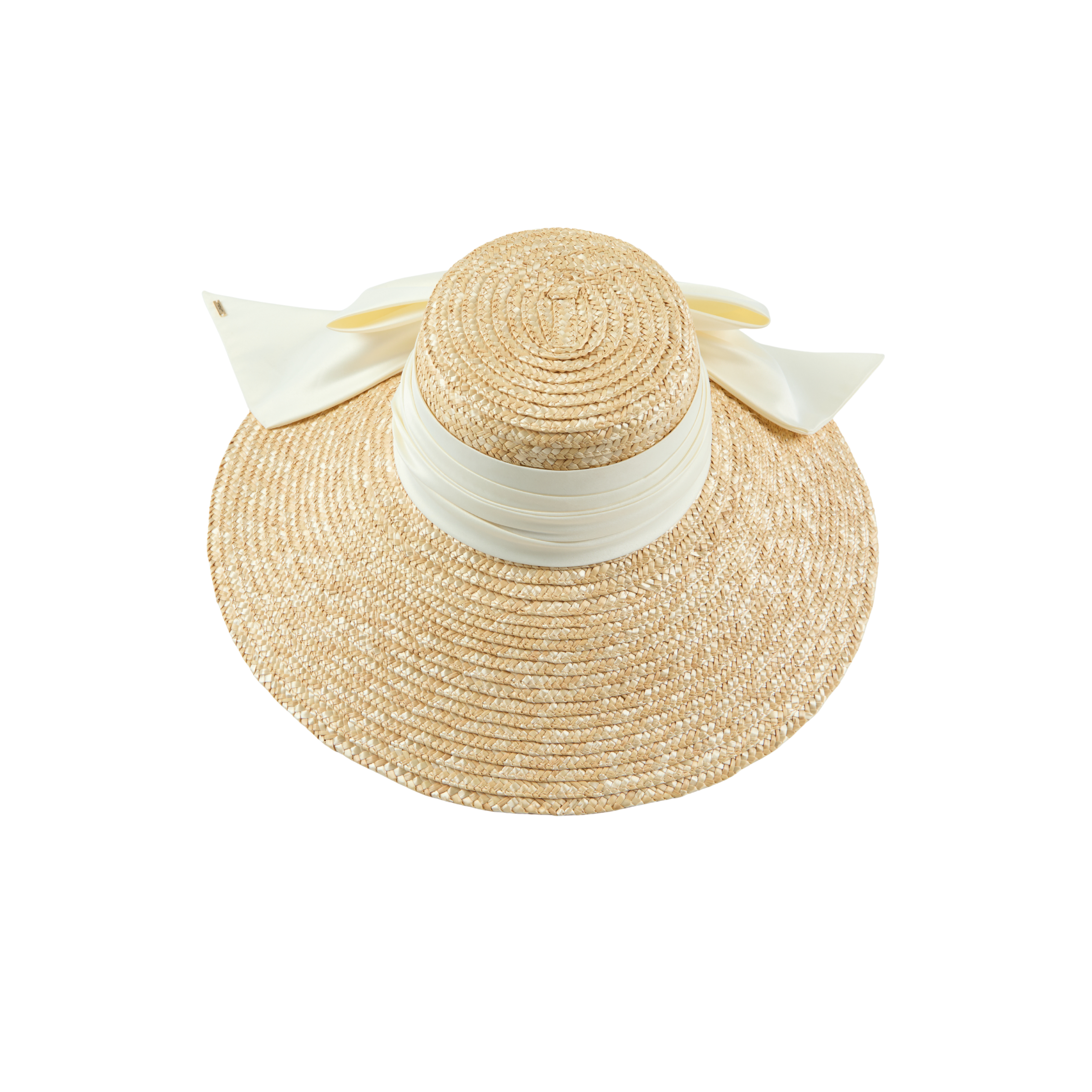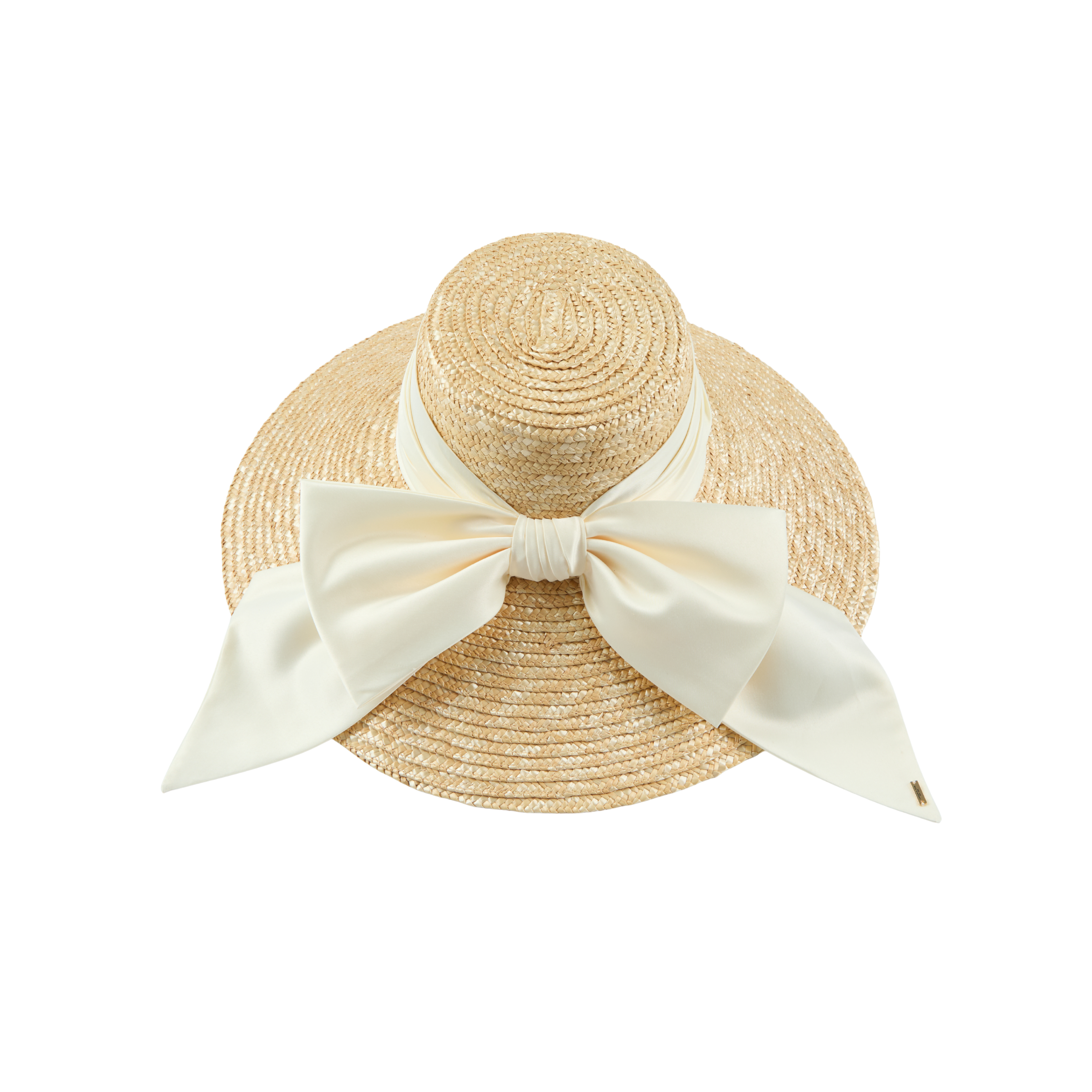 Mirabel Natural straw sunhat with cream satin bow. Includes discreet adjustable grosgrain band desired fit.