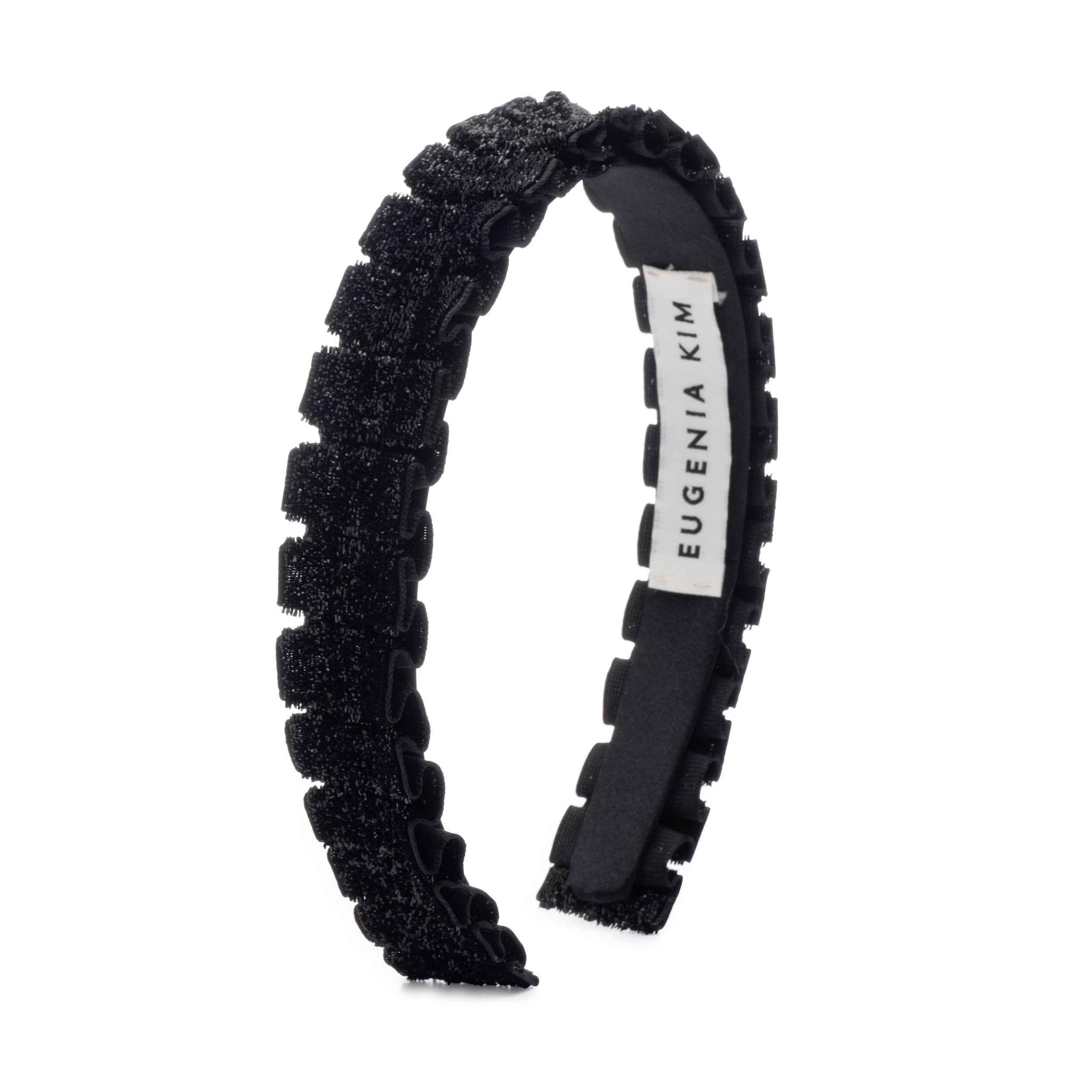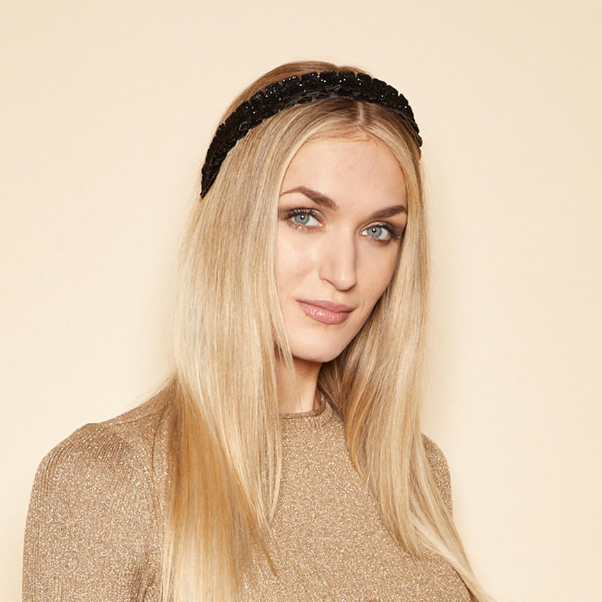 Black ruffled metallic velvet headband.